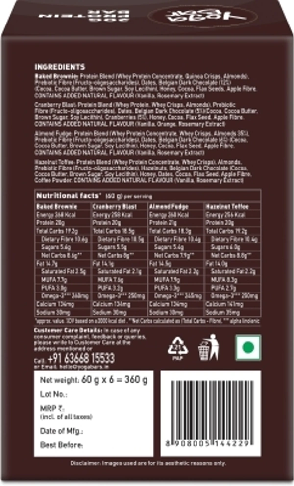 Yogabar 20g Whey Protein Bar | Pack of 6 Bars | Almond Fudge, Chocolate Cranberry, Baked Whey Protein